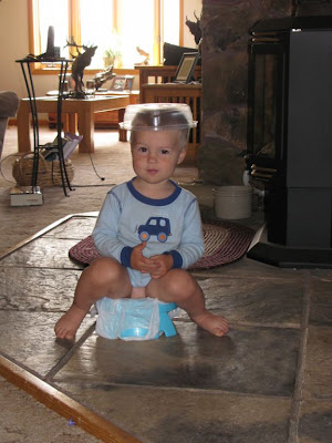We haven't pushed the potty training very hard but we do try to use it every so often. Why wouldn't you wear a tupperware bowl for a hat while trying to do your business?
